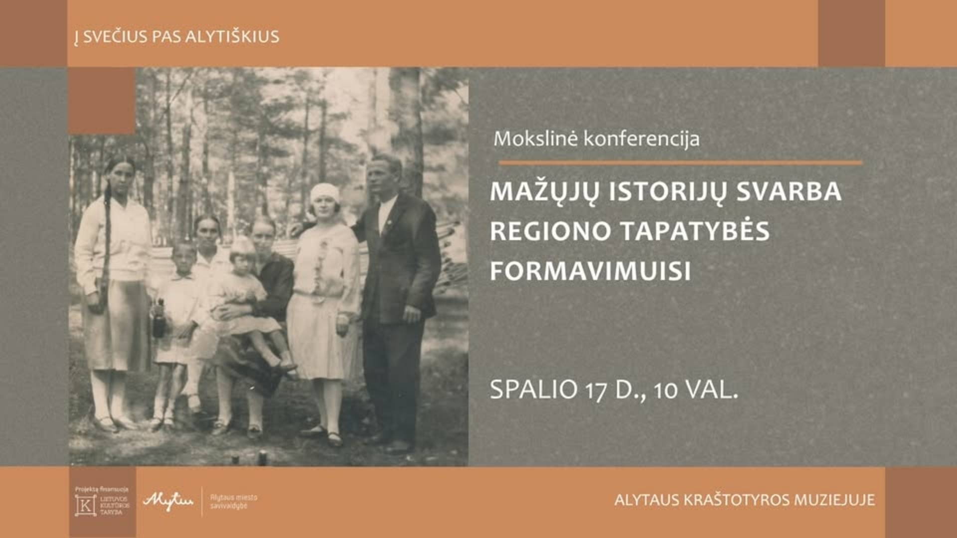 Spalio 17 d., 10 val. kviečiame į mokslinę konferenciją „Mažųjų istorijų svarba regiono tapatybės formavimuisi“ Pranešimus skaitys mokslininkai, tyrinėjantys kasdienybės istoriją ir antropologiją. Kalbėsime apie šeimos, kaip socialinio vieneto, psichologinius, ekonominius ir istorinius aspektus. Pristatysime Alytuje gyvenusių šeimų istorijas, atskleidžiančias mūsų miesto kultūrinės atminties lobyną.Konferencija papildo šiuo metu veikiančią parodą ,,Į svečius pas alytiškius“, tad renginio dalyviai galės ne tik klausytis pranešimų, bet ir patirti, kaip mažosios istorijos susipina su miesto kasdienybe. Konferencija skirta Alytaus bendruomenei ir visiems, kuriems svarbi regiono tapatybė bei kultūrinė atmintis.