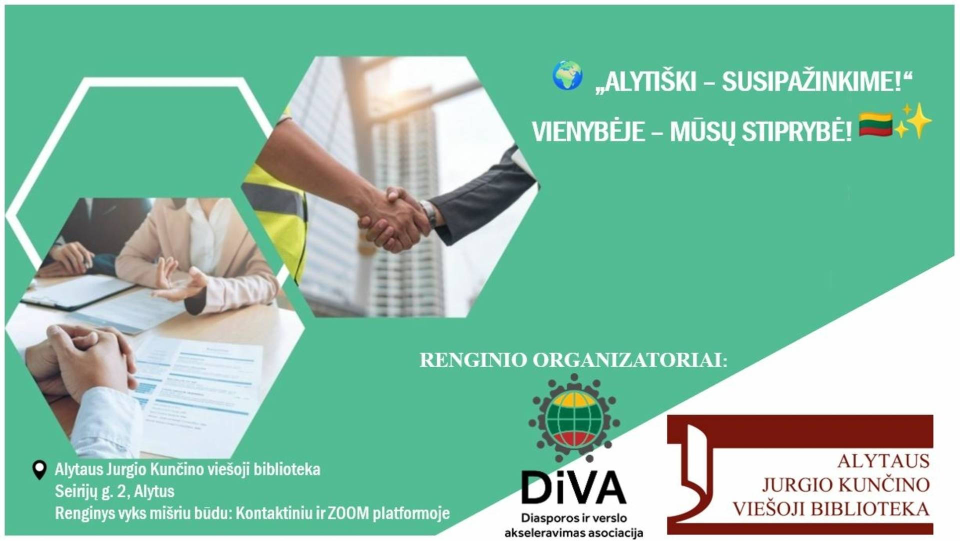 Alytaus Jurgio Kunčino viešoji biblioteka ir asociacija „DiVA” (Diasporos ir verslo akseleravimas) kviečia į nemokamą hibridinį kontaktų renginį (gyvai ir nuotoliu per „Zoom“).