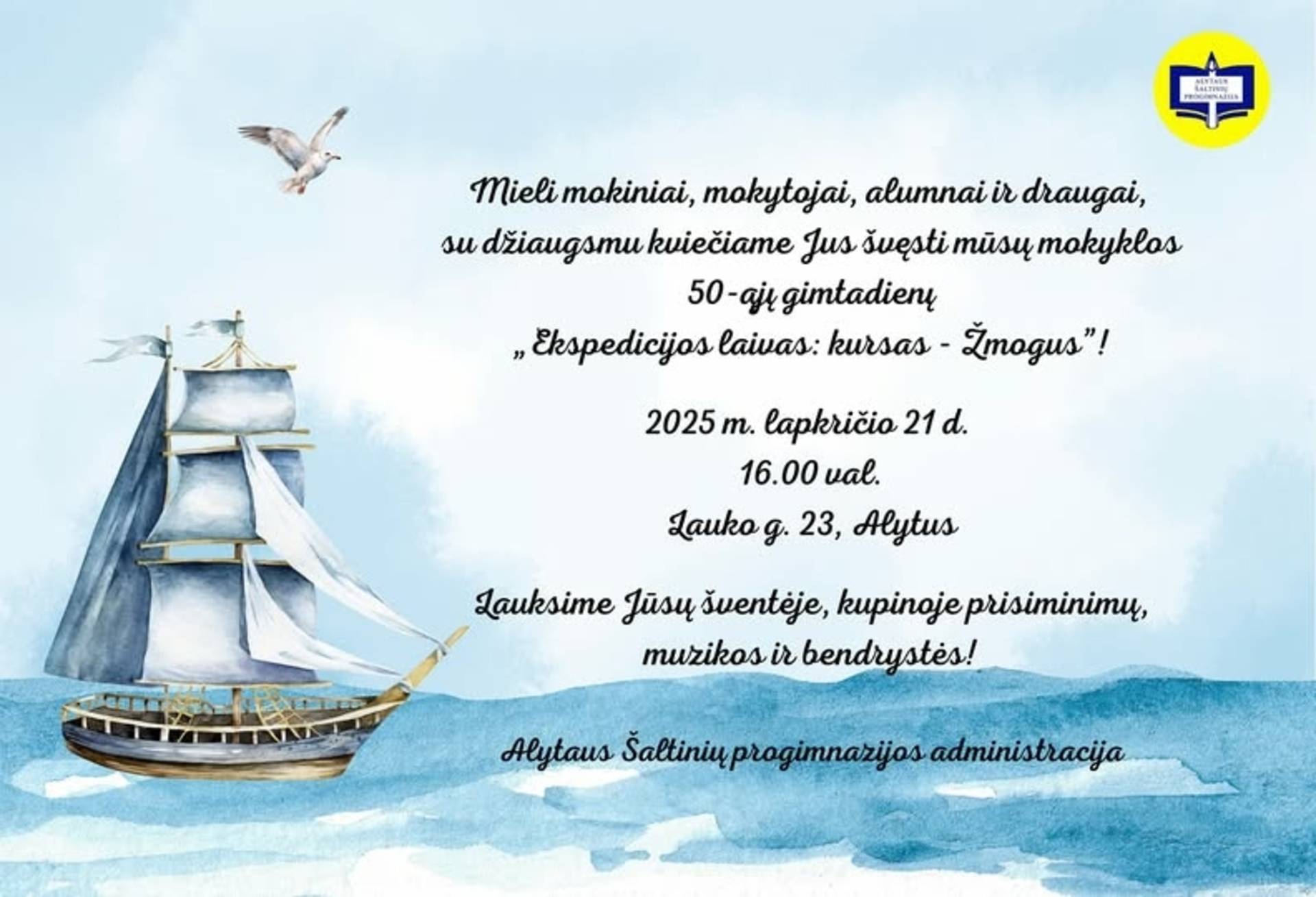 16.00 val. gimtadienio šventė "Ekspedicijos laivas: kursas - Žmogus!" renginių salėje. Būsite? Laukiame su šypsena ir šventine nuotaika!