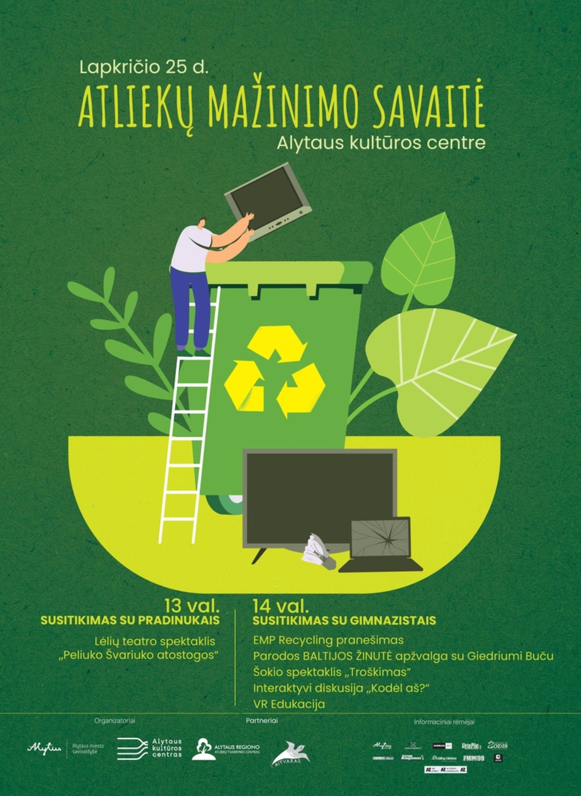 Lapkričio 25 d. Alytaus kultūros centre vyksiantys Atliekų mažinimo savaitės renginiai kviečia pažvelgti į tvarumą kūrybiškai – nuo edukacijos ir meno iki technologijų. Šių metų tema – elektronikos atliekų rūšiavimas ir perdirbimas.
