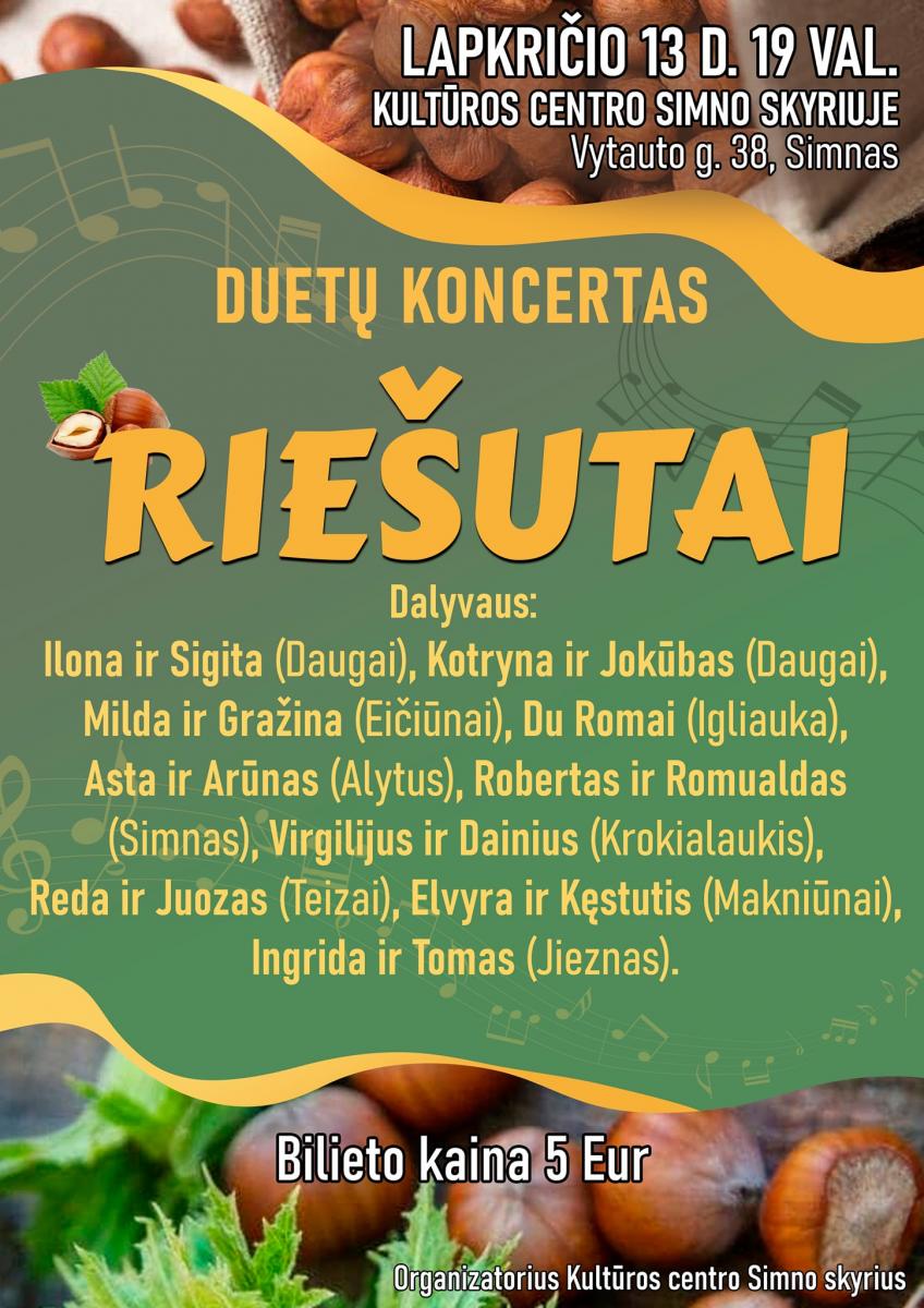 Kultūros centro Simno skyriuje vyks duetų koncertas „Riešutai“.