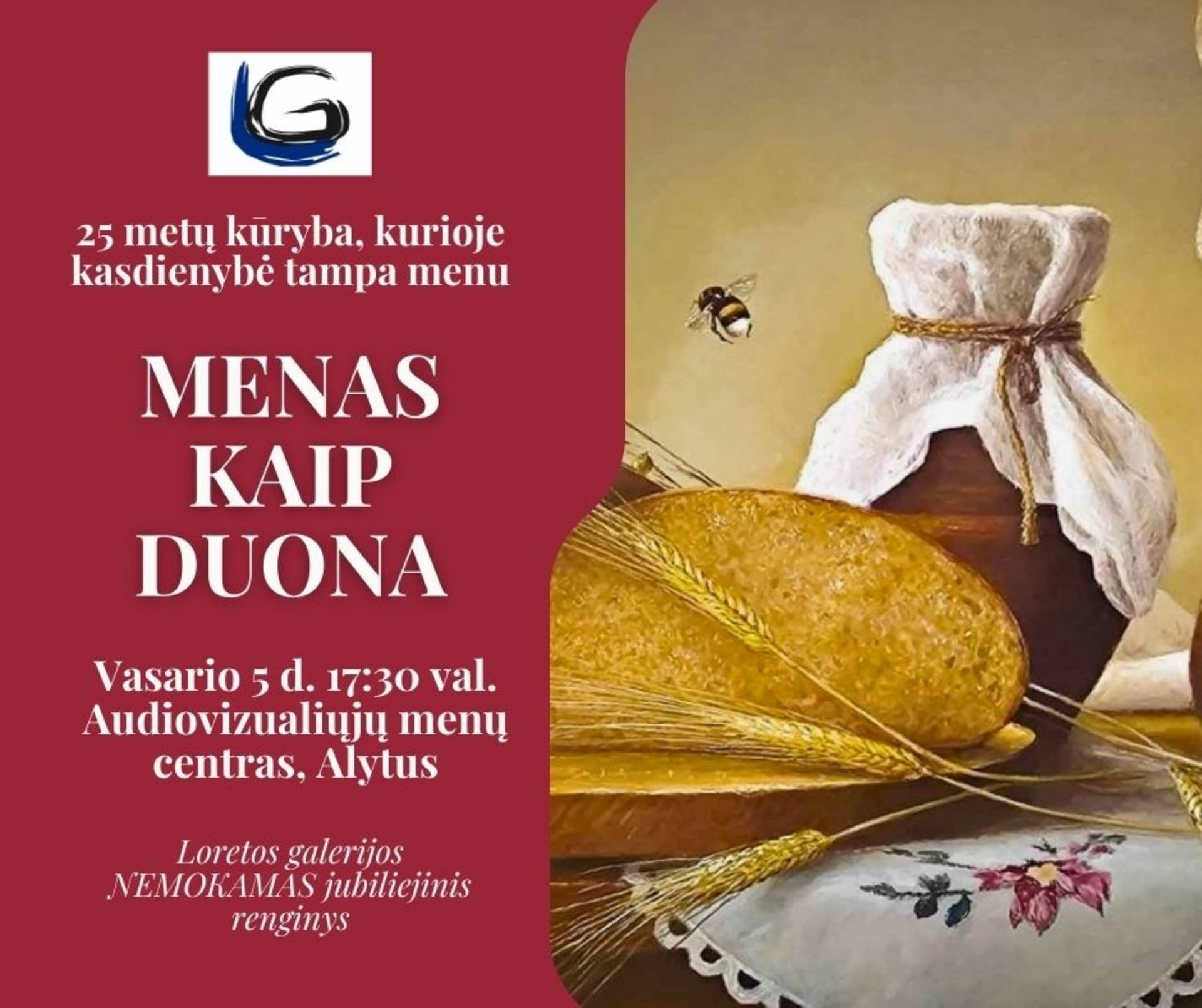 „Loretos galerija“ švenčia 25-erius kūrybos metus ir kviečia į jungtinę menininkų parodą „Menas kaip duona“ – apie meną, kuris maitina sielą ir jungia žmones.