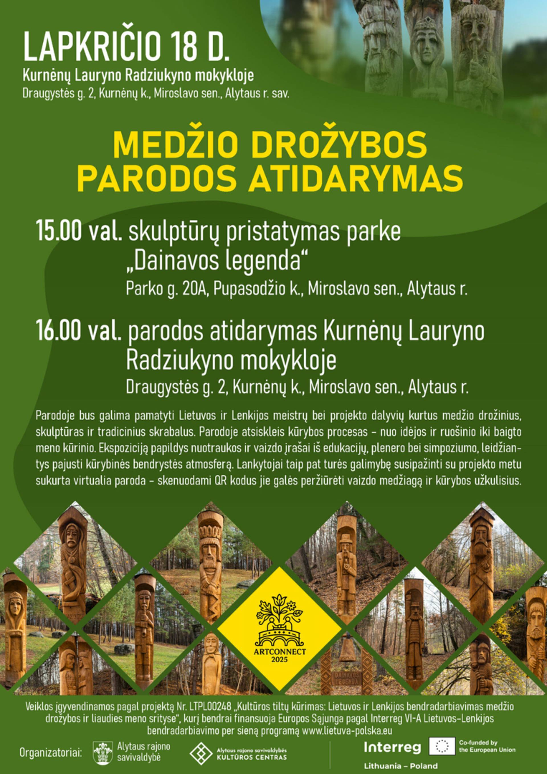 Lapkričio 18 dieną, kviečiame apsilankyti Kurnėnų Lauryno Radziukyno mokykloje! Čia vyks medžio drožybos parodos atidarymas. Veikla įgyvendinama pagal projektą Nr. LTPL00248 „Kultūros tiltų kūrimas: Lietuvos ir Lenkijos bendradarbiavimas medžio drožybos ir liaudies meno srityse“, kurį bendrai finansuoja Europos Sąjunga pagal Interreg VI-A Lietuvos-Lenkijos bendradarbiavimo per sieną programą http://www.lietuva-polska.eu