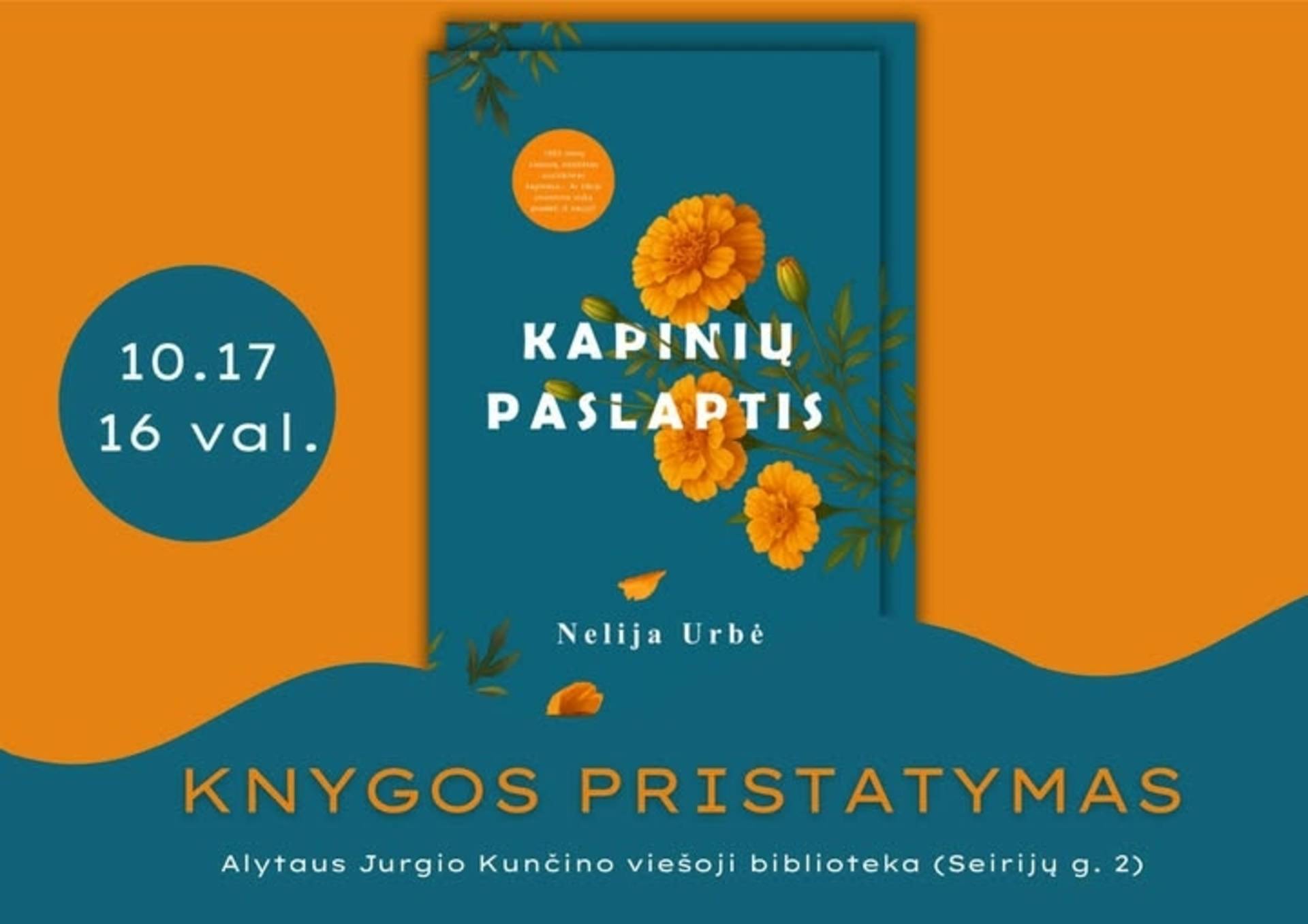 Auksaspalviam rudeniui įpusėjus kviečiame į rašytojos, alytiškės Nelijos Urbės romano „Kapinių paslaptis“ pristatymą. Į jaukų pasibuvimą autorė kviečia spalio 17 d. 16 val. Alytaus Jurgio Kunčino viešosios bibliotekos renginių salėje (Seirijų g. 2).