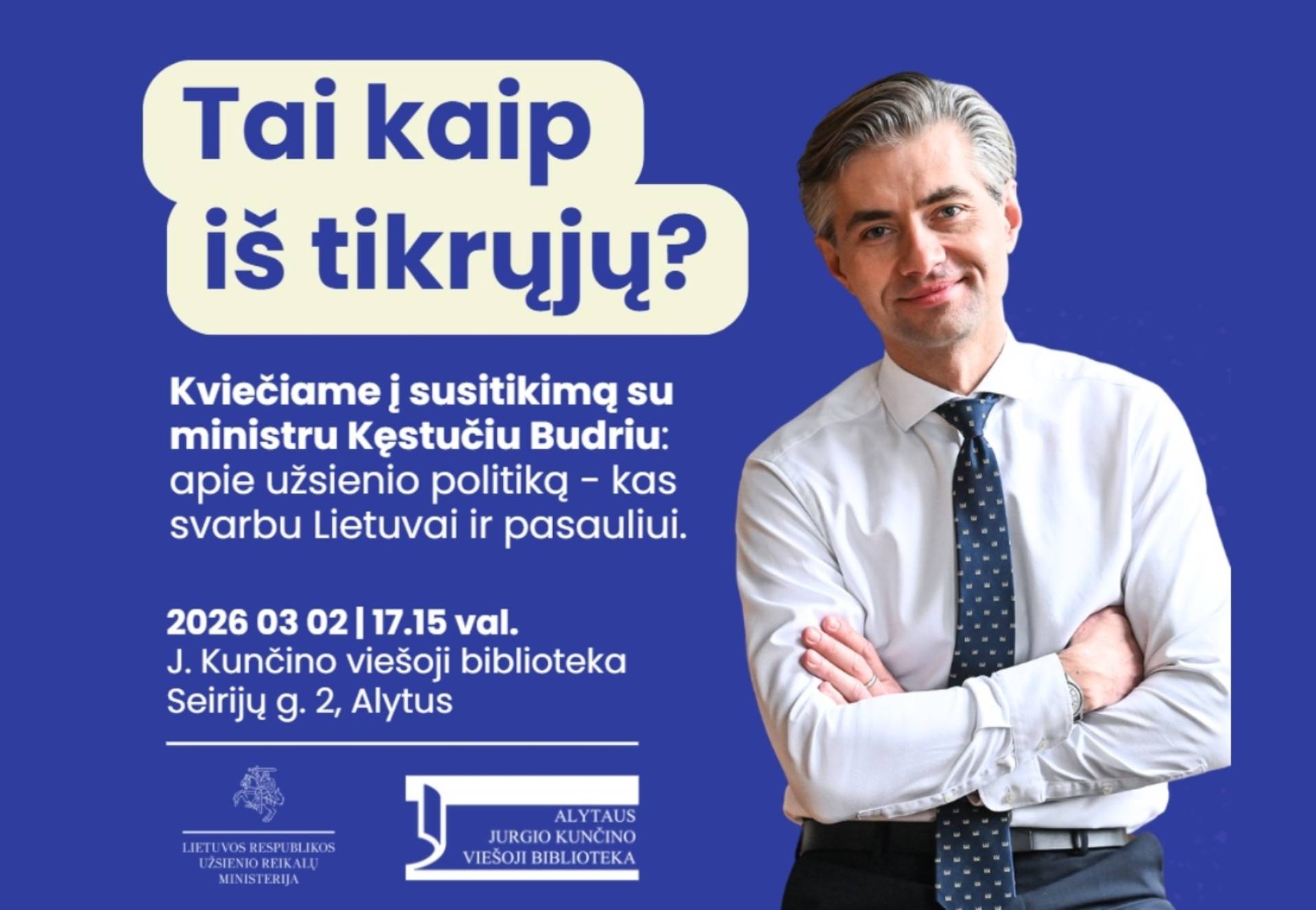 Kovo 2 d. (pirmadienį), 17.15 val., LR Užsienio reikalų ministerija kviečia Alytaus gyventojus į atvirą ir neformalų pokalbį su užsienio reikalų ministru Kęstučiu Budriu apie Lietuvos užsienio politiką, kuris vyks Alytaus Jurgio Kunčino viešosios bibliotekos renginių salėje (Seirijų g. 2). Pasikalbėkime apie tai, kas šiandien svarbu Lietuvai ir pasauliui.