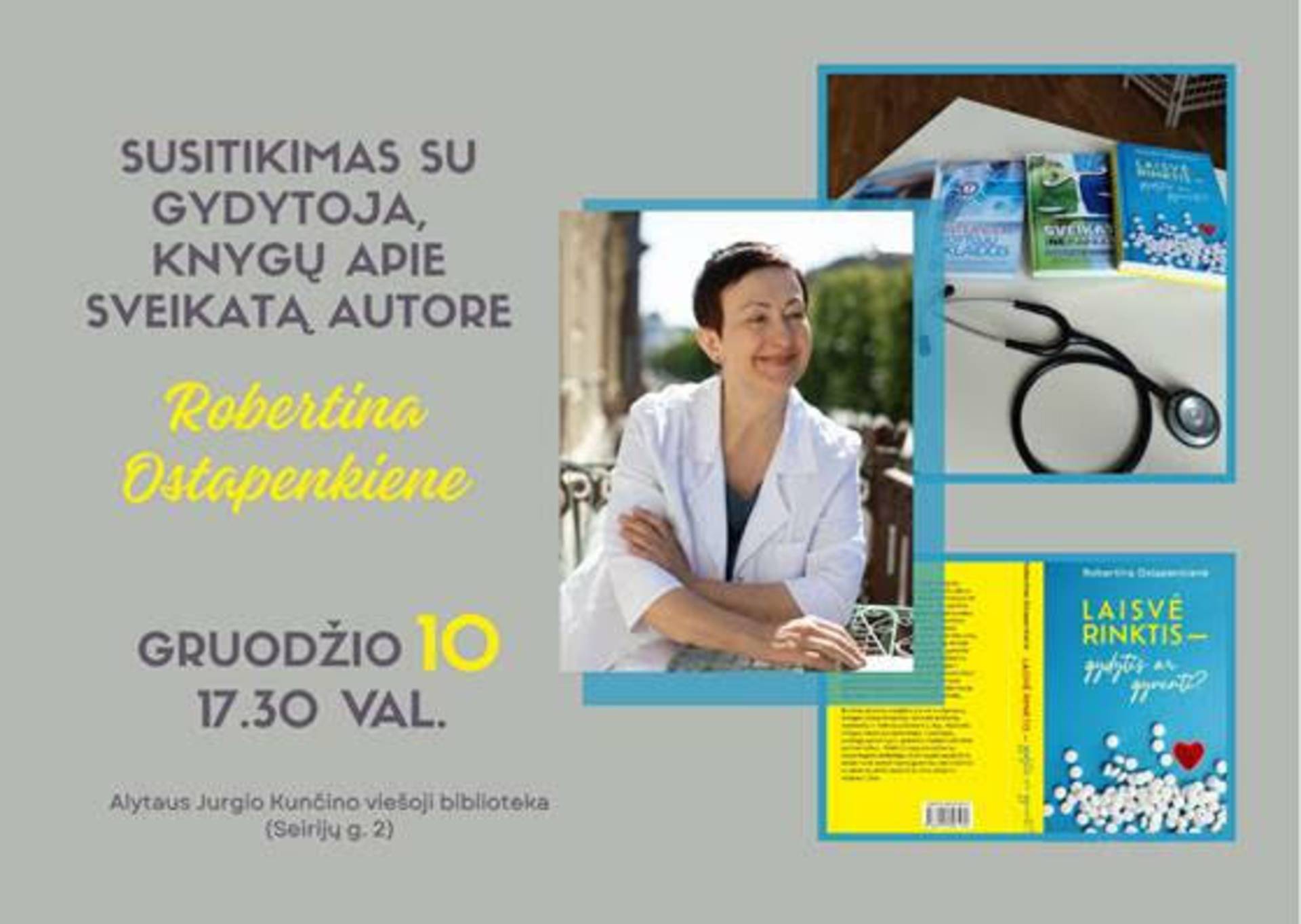 Gruodžio 10 d. 17.30 val. Alytaus Jurgio Kunčino viešojoje bibliotekoje (Seirijų g. 2) vyks susitikimas su gydytoja, knygų „Vaistai nuo ligų ar ligos nuo vaistų“, „Pavojingos gydytojų klaidos“, „Sveikata (ne)kainuoja“, „Laisvė rinktis – gydyti ar gyventi“ autore Robertina Ostapenkiene.