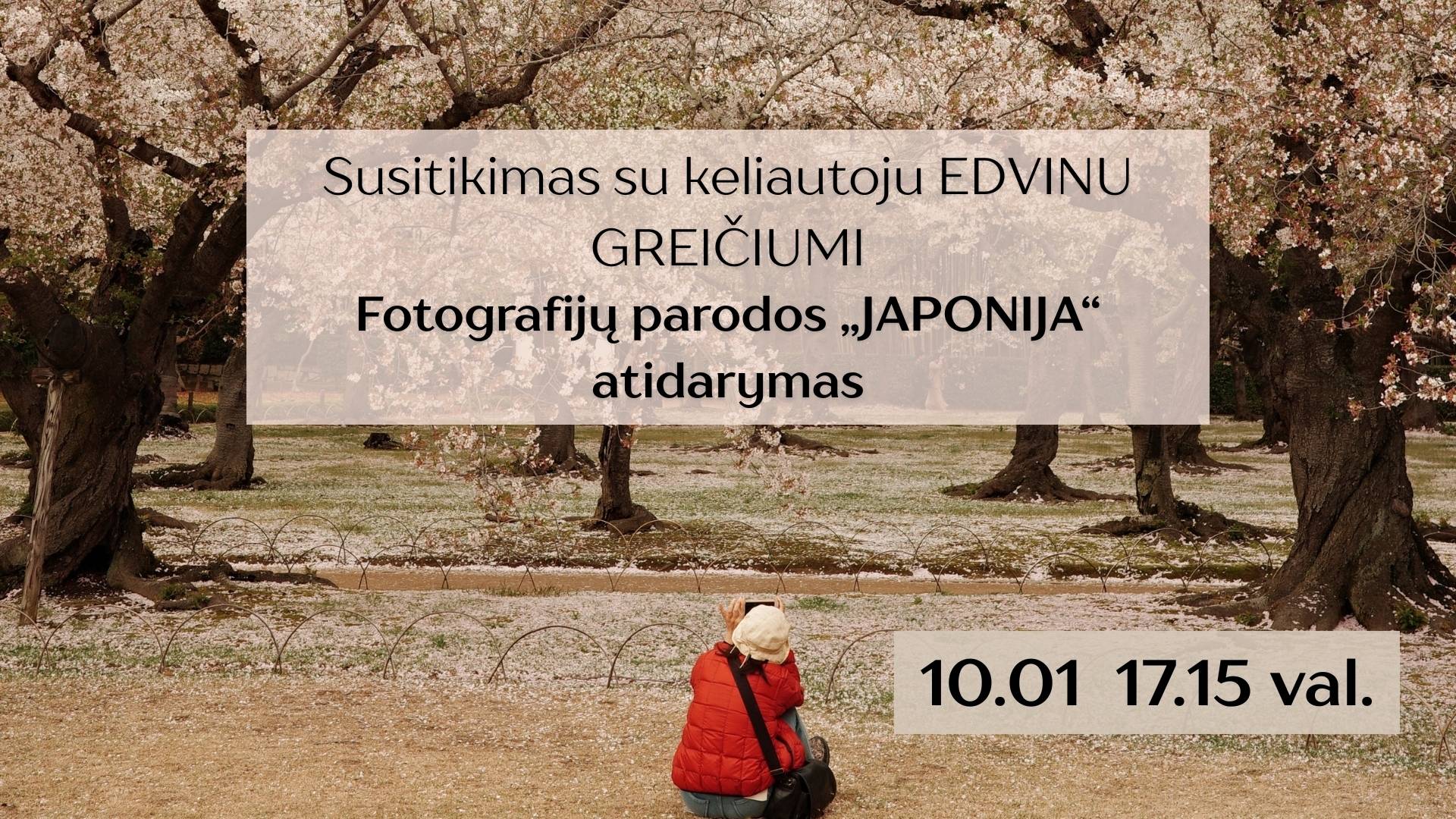 Parodoje pakeliausite lėktuvais ir traukiniais, gastronomines patirtis keis kultūrinės ir atvirkščiai, kol viską vainikuos didingas Fuji kalno vaizdas. Tikiuosi, kad Japonija įstrigs į Jūsų atmintį žmonių nuoširdumu, gamtos grožiu, šventyklų didybe, skonių įvairove ir neaprėpiamais kultūros klodais. Žydinčias sakuros pavasarį, o rudenį – įvairiaspalviais raštais pasipuošę klevai, ginkmedžiai. O viską lydi maloni patirtis ir iš žmonių spinduliuojanti šiluma“, – trumpai savo personalinę fotografijų parodą pristato ir į artėjantį renginį kviečia keliautojas Edvinas Greičius.