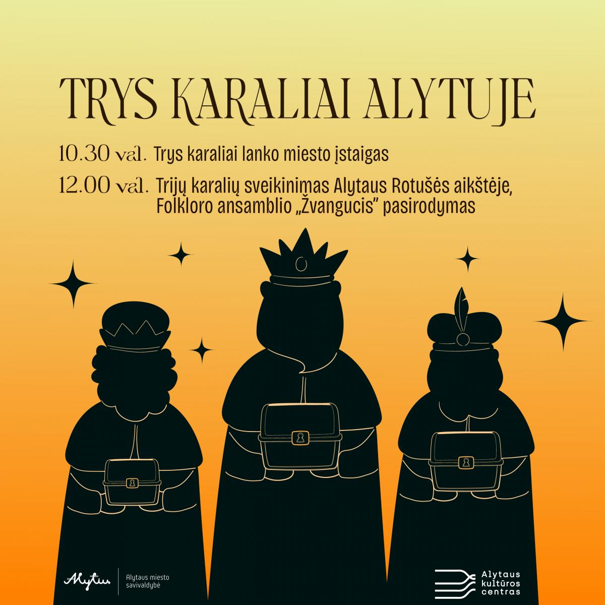 Tradiciškai, šventinį laikotarpį užbaigs Trys karaliai. Kasparas, Melchioras ir Baltazaras, trys išminčiai iš Rytų, lankys miesto įstaigas, įmones ir sveikins visus, atvykusius susitikti Alytaus Rotušės aikštėje. Kartu dalyvaus ir Alytaus kultūros centro folkloro ansamblis „Žvangucis“.