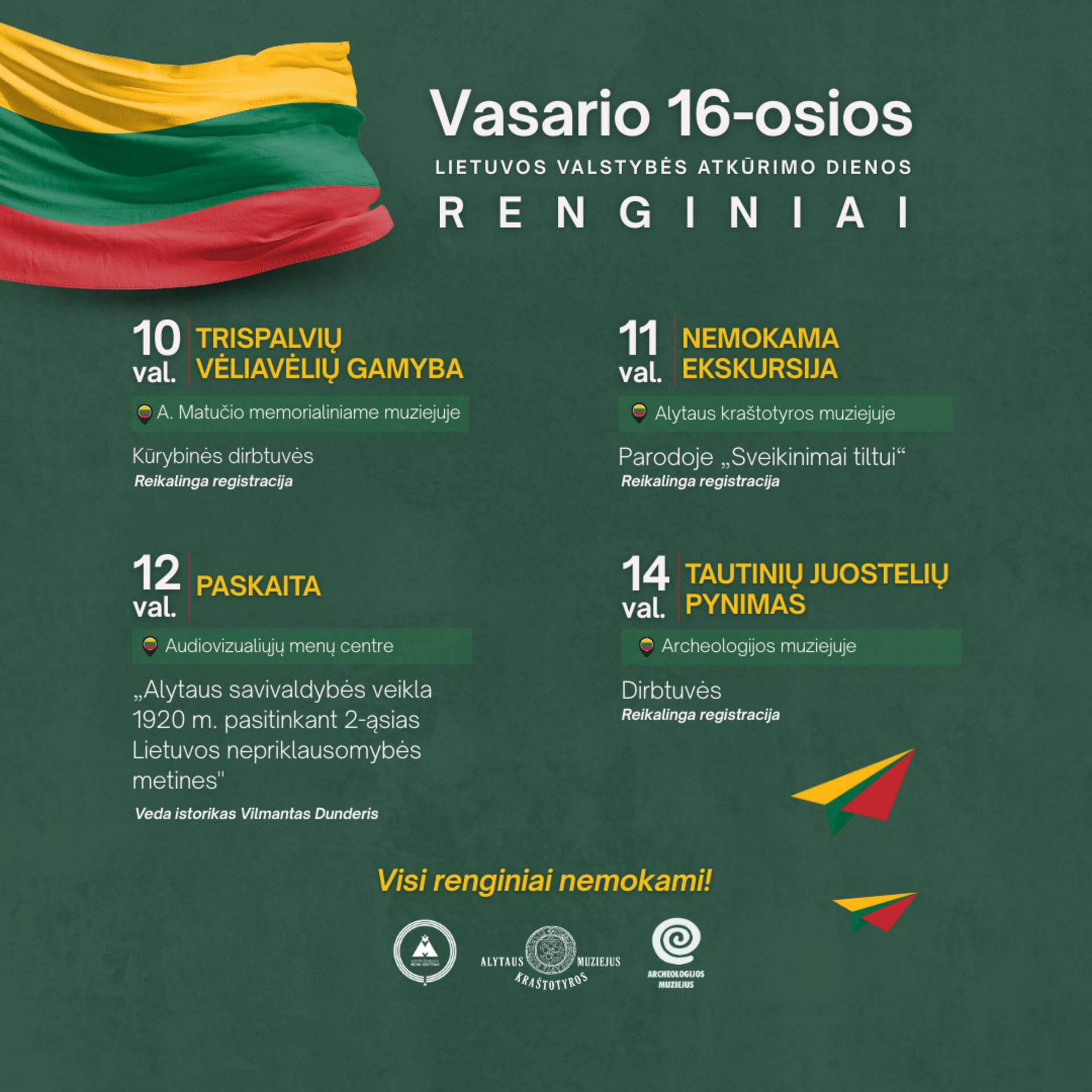 Kviečiame prasmingai paminėti Lietuvos valstybės atkūrimo dieną Alytaus kraštotyros muziejuje bei jo padaliniuose – jūsų laukia nemokami renginiai ir edukacijos!